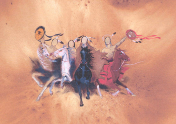 This painting, titled "The Four Horsemen of the Lakota," depicts the Four Horsemen of the Apocalypse, dressed in traditional Lakota regalia and riding in tight formation on colorful horses. Yet the horsemen are not harbingers of war, famine, death and pestilence. Burnette said they represent the Lakota virtues of Spirituality, Integrity, Courage and Wisdom, "riding hard and fast as victors in the battle between complacency and achievement." The horsemen have come from the four directions to centralize their power, according to Burnette, and the four horses represent the colors of the four directions.